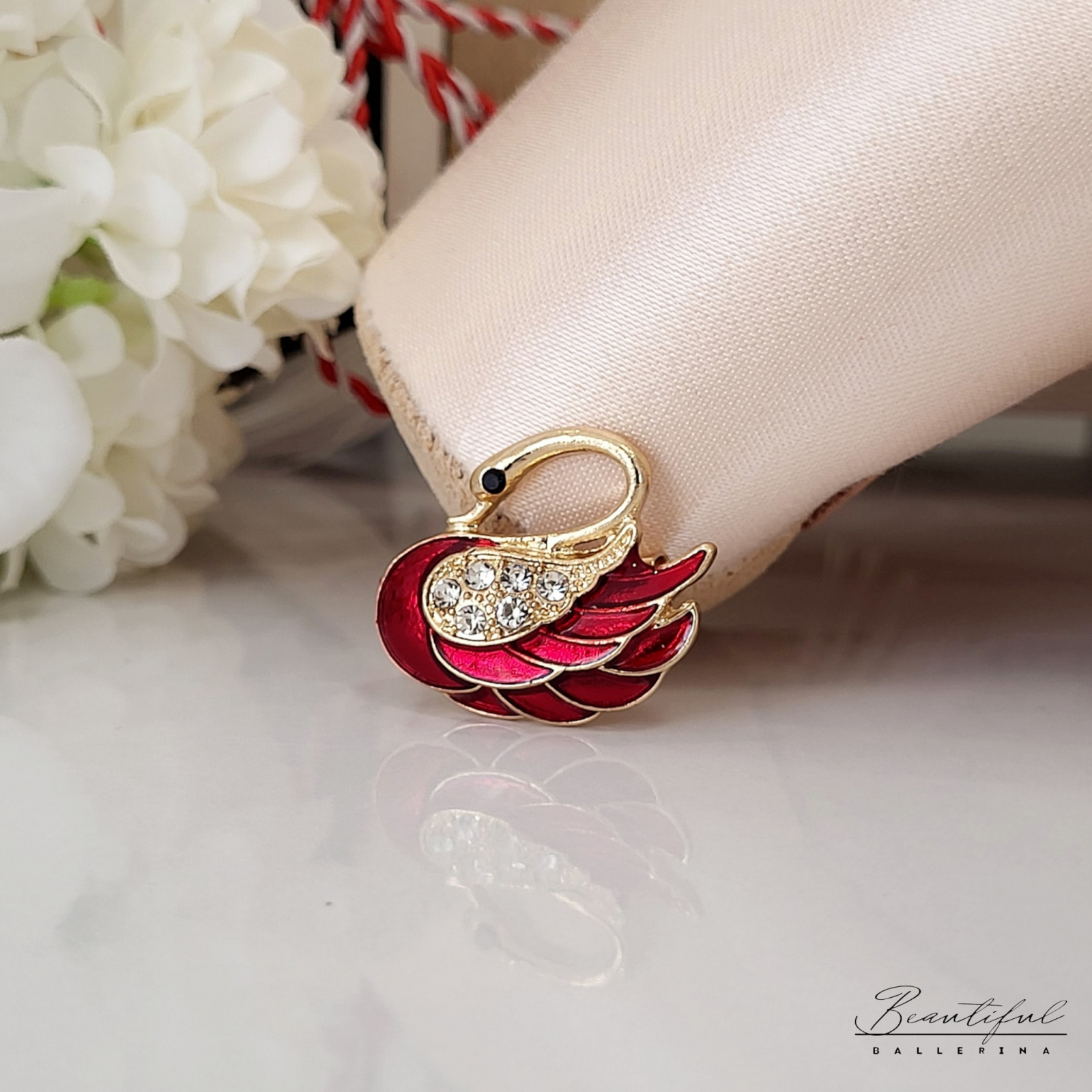 Brosa martisor in forma de lebada accesorizata cu pietre albe si perla realizata pe baza aurie din metale comune. Un accesoriu elegant, nobil, ideal pentru a fi oferit persoanelor dragi.